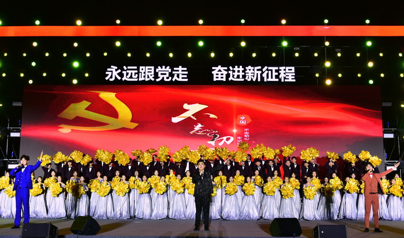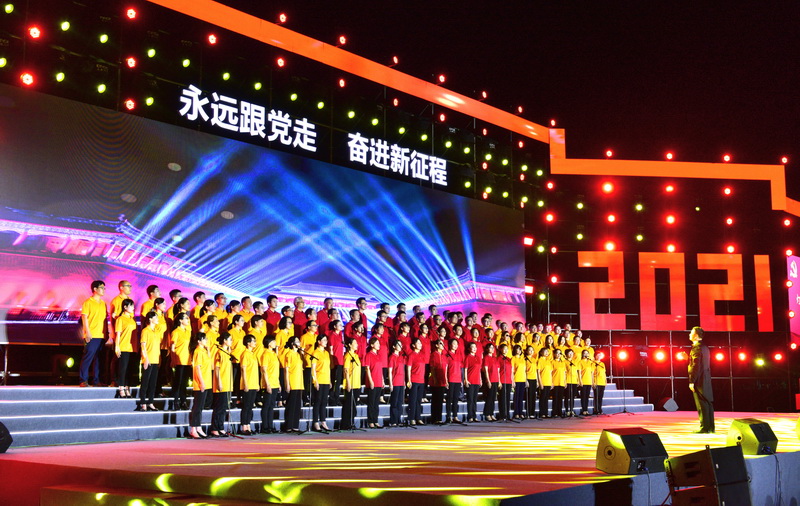 歌会在歌曲《我宣誓》中拉开序幕,入党誓词谱写成歌曲,配合舞台上激情澎湃、振奋昂扬的画面,唱响了永远跟党走、奋进新时代的主旋律。整场演出紧贴建党百年主题,紧扣时代发展脉搏,铿锵凝重的《跟着共产党走》、情深似海的《十送红军》、气势磅礴的《英雄赞歌》,以浓郁的情感基调、强烈的节奏感抒发着对党的忠诚与热爱;舞蹈表演《红旗颂》,以一抹绚丽的红色染透舞台,体现了新时代年轻人对于革命精神的薪火相传;《新的天地》《向往》《保卫黄河》《破浪》等歌曲轮番上演,展现出中国共产党成立一百年以来顽强拼搏、勇于逐梦的伟大精神;朗诵节目《百年》,以“百年”书写青春,以岁月书写当下;歌舞《沂蒙颂》,表现了军民水乳交融、生死与共铸就的沂蒙精神;歌曲《我爱你中国》《我的祖国》《灯火里的中国》抒发对中国的万分热爱与赞美;歌曲《少年》《追寻》《乘风破浪再出发》更展时代强音;教工百人团合唱《星空手机官方网站校歌》,缓缓推开一代代科大人坚持惟真求新、奋发图强、砥砺前行的画卷。