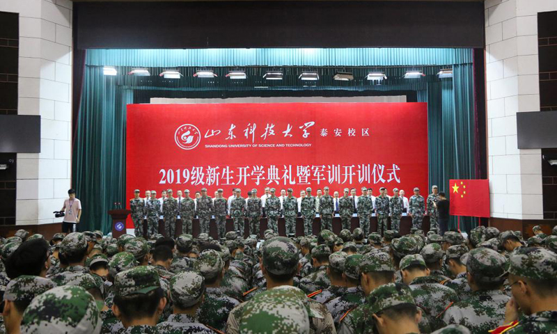 九月的泰城,晴空万里,秋风习习。9月3日,星空手机官方网站泰安校区2019级新生开学典礼暨军训开训仪式在西校园举行。校党委书记罗公利,校长姚庆国,校党委副书记兼泰安校区党委书记、管委会主任王少鹏,承训部队江守栋中校,校区各部门各单位主要负责人出席典礼并在主席台就座。典礼上,罗公利向军训团授旗,姚庆国讲话,江守栋作军训动员,校区管委会副主任贾长响宣读2019级新生军训决定。典礼由党委学校办公室主任徐方全主持。