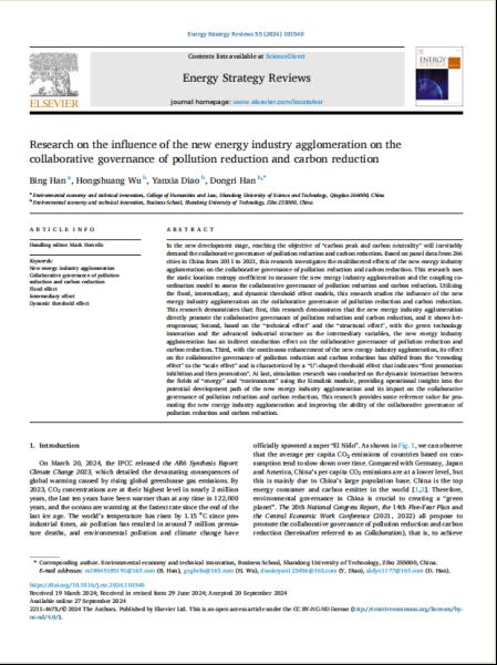 近日,星空手机官方网站文法学院讲师韩冰在《Energy Strategy Reviews》发表题为“Research on the influence of the new energy industry agglomeration on the collaborative governance of pollution reduction and carbon reduction”的文章。