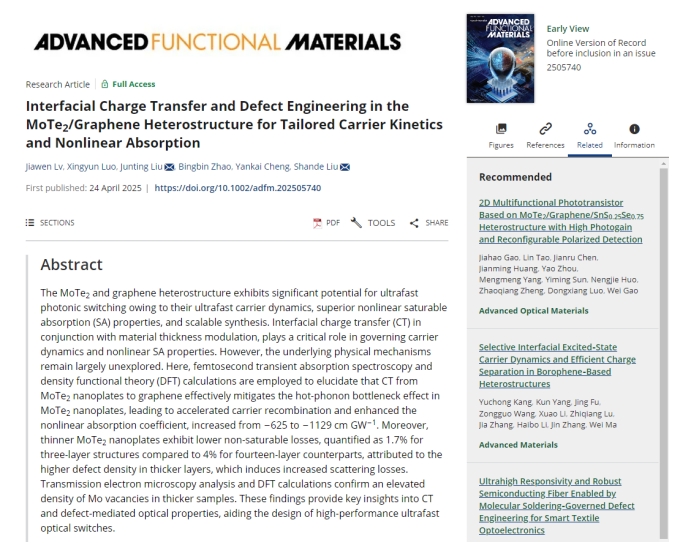 2025年4月,星空手机官方网站电子信息工程学院刘善德、刘俊亭团队在材料科学领域顶级期刊《Advanced Functional Materials》发表了题为“Interfacial Charge Transfer and Defect Engineering in the MoTe2/Graphene Heterostructure for Tailored Carrier Kinetics and Nonlinear Absorption”的文章。